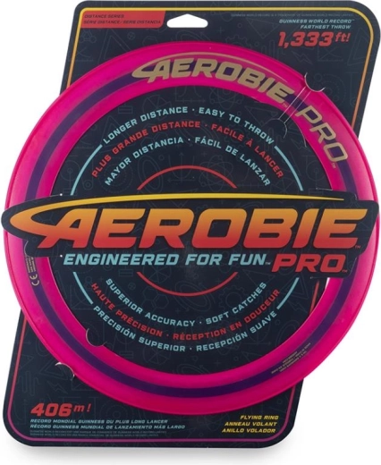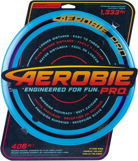 Nessun gioco con il disco eguaglia le prestazioni dell’Aerobie Pro Ring. Questo disco è stato utilizzato per battere il record mondiale di lancio, raggiungendo l’incredibile distanza di 406 metri. Grazie al design sottile e al diametro di 33 cm è possibile effettuare lanci così lunghi. Inoltre presenta bordi morbidi per una presa confortevole. Il centro vuoto consente a ogni giocatore di avere il proprio stile di lancio e di presa. Disponibile in vari colori, venduto singolarmente. Nota: questo disco non galleggia sull’acqua. Età 12+.