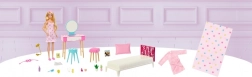 Questa cameretta riccamente accessoriata con la bambola Barbie trasforma ogni gioco in un momento di relax e in storie divertenti. Include un letto con coperta, un comodino e una toeletta con specchio, grazie ai quali i bambini possono facilmente ricreare le preparazioni del mattino e il rilassamento serale.