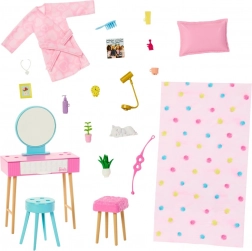 La bambola indossa un allegro pigiama, pantofole pelose e un morbido accappatoio rosa per il massimo comfort. L’atmosfera autentica è completata da una lampada, una piantina, una rivista, una spazzola, un cerchietto e una mascherina per dormire – tutto pronto per styling e cura.