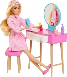 Barbie può pettinarsi, sistemarsi e prepararsi per la giornata. Non mancano spazzola, boccette e un cassetto per i piccoli oggetti per un’organizzazione ordinata.