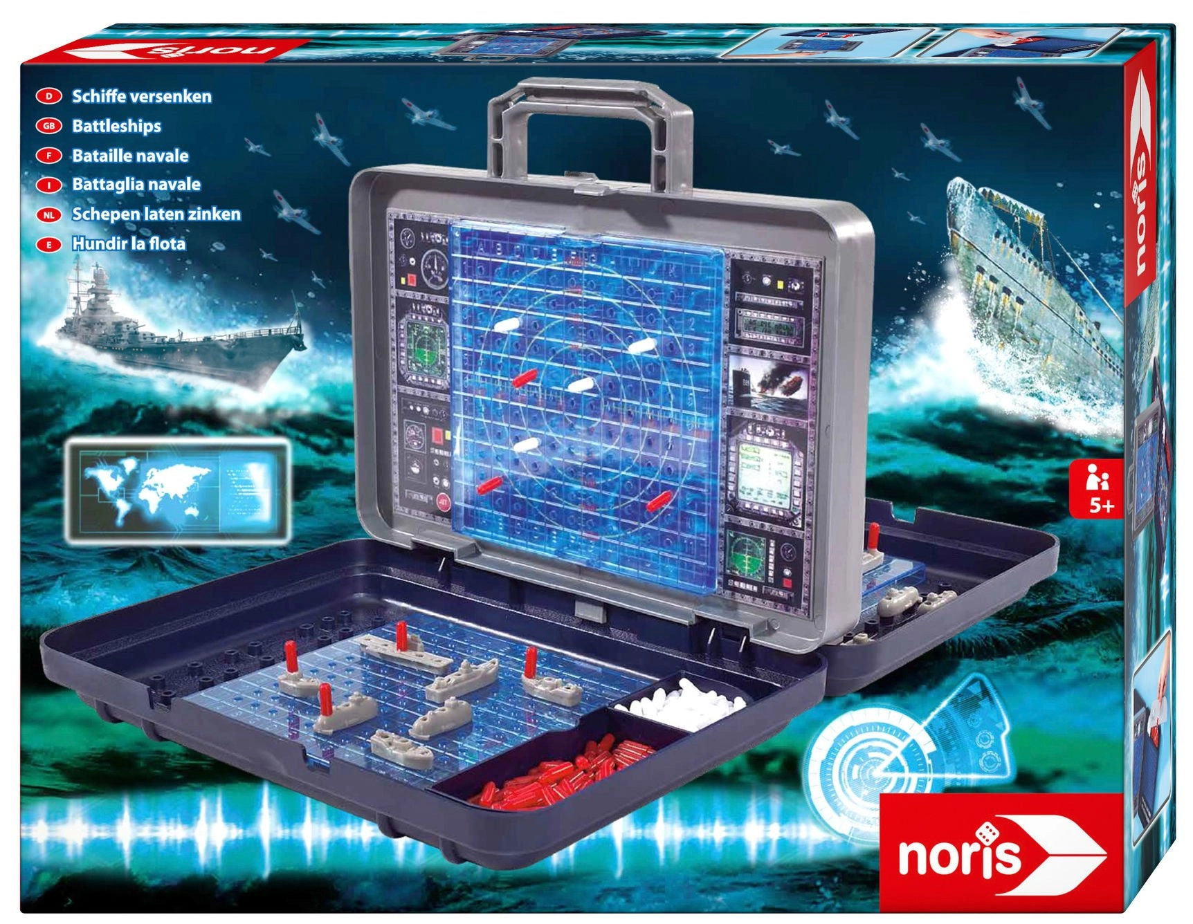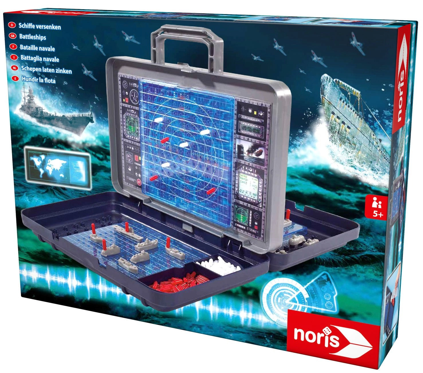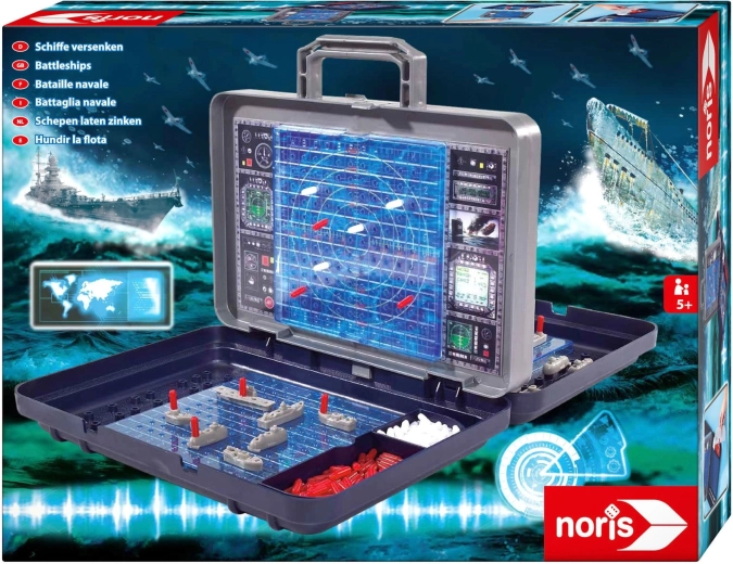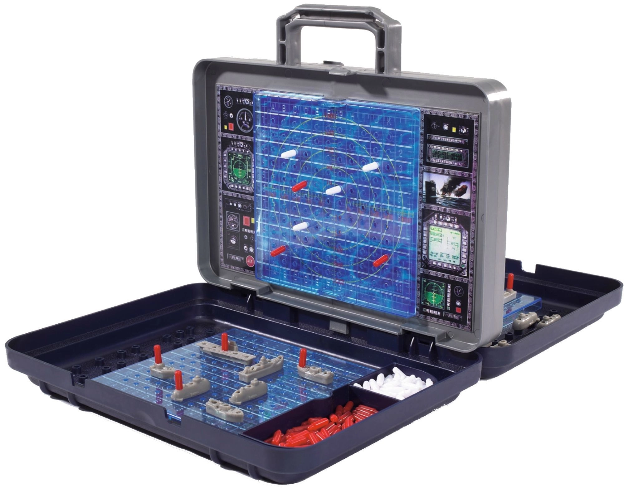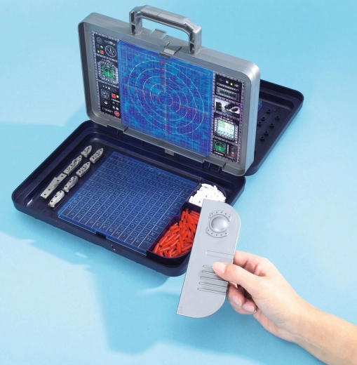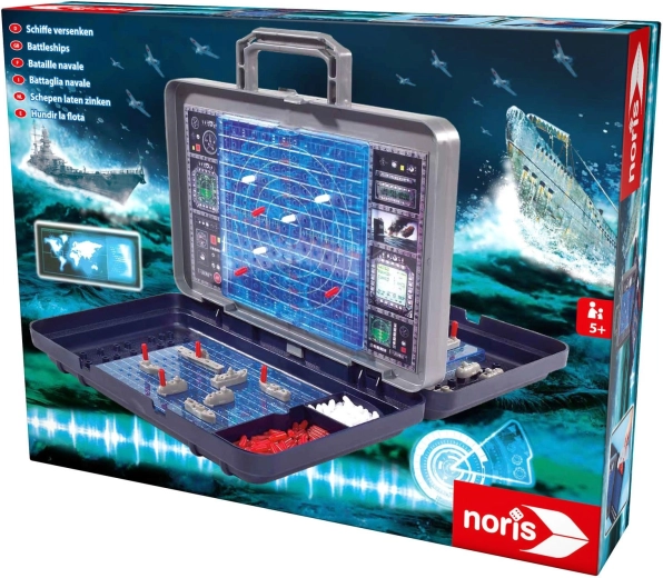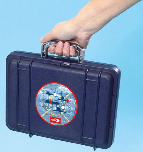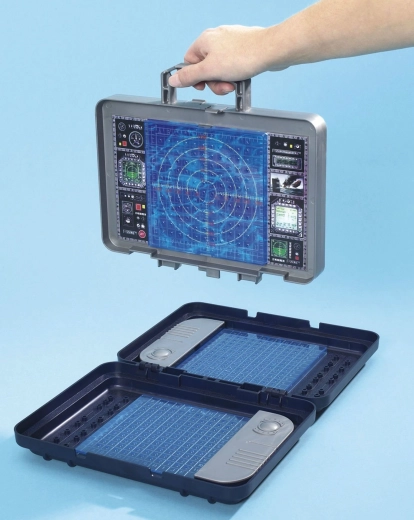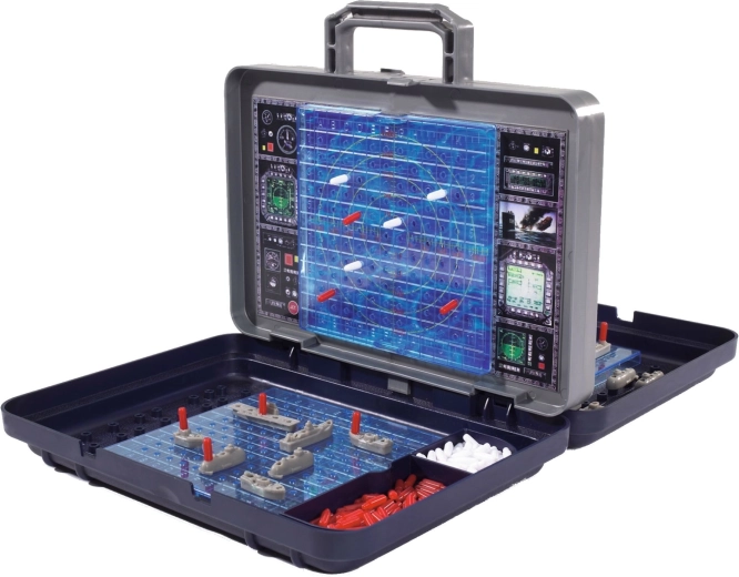 Il cuore del set è la parete verticale rimovibile in stile radar, che separa i due campi di gioco. Su di essa puoi segnare colpi a segno e mancati e al tempo stesso garantire che i giocatori non vedano la disposizione delle navi altrui. Gli scomparti integrati nella valigetta mantengono tutti i pezzi ben in ordine.