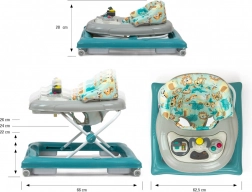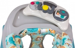 Il prodotto è dotato di un pannello educativo che contiene una serie di sorprese per i piccoli esploratori: lucine, fischietti, melodie, sonagli, pulsanti e altri elementi mobili. Rimuovendo il pannello dalla vaschetta del girello, può essere utilizzato come giocattolo autonomo, ad esempio come piacevole compagno di viaggio, mentre la parte superiore funge da tavolino da gioco.