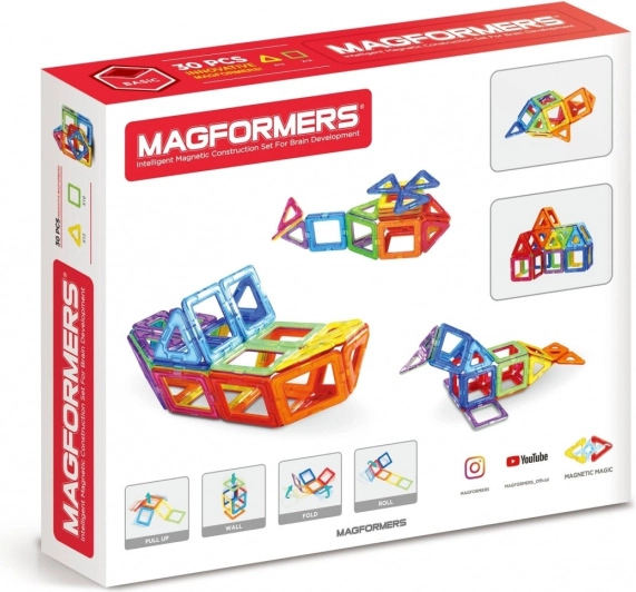 Magformers Basic 30 sono blocchi con potenti magneti al neodimio integrati, che si attraggono sempre tra loro. Basta avvicinare due blocchi con le loro facce e si uniranno immediatamente. Grazie ai blocchi modellati secondo forme geometriche, puoi costruire splendide strutture tridimensionali. Per giocare puoi usare il manuale incluso, altri esempi sul sito magformersworld.com oppure la tua fantasia. Il set include: 12 triangoli; 18 quadrati.