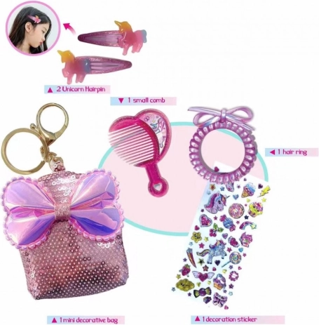 - Pochette con paillettes e fiocchetto (utilizzabile come pendente), 2 fermagli con unicorno, pettinino, elastico a spirale, foglio di adesivi