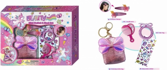 Un delizioso set per capelli da bambina con motivo unicorno che farà felice ogni piccola fashionista. Include una pochette decorativa con paillettes e fiocchetto, che può essere usata anche come portachiavi/pendente, inoltre 2 fermagli con unicorno, un pettinino, un elastico a spirale e un foglio di adesivi. Ideale come regalo.
