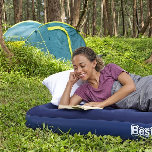 Goditi un sonno confortevole ovunque: il materasso gonfiabile BESTWAY con superficie in velluto morbida come il velluto è piacevole al tatto e trattiene meglio il lenzuolo. La resistente struttura coil‑beam garantisce stabilità ed elasticità, così il materasso mantiene la forma e sostiene bene il corpo.