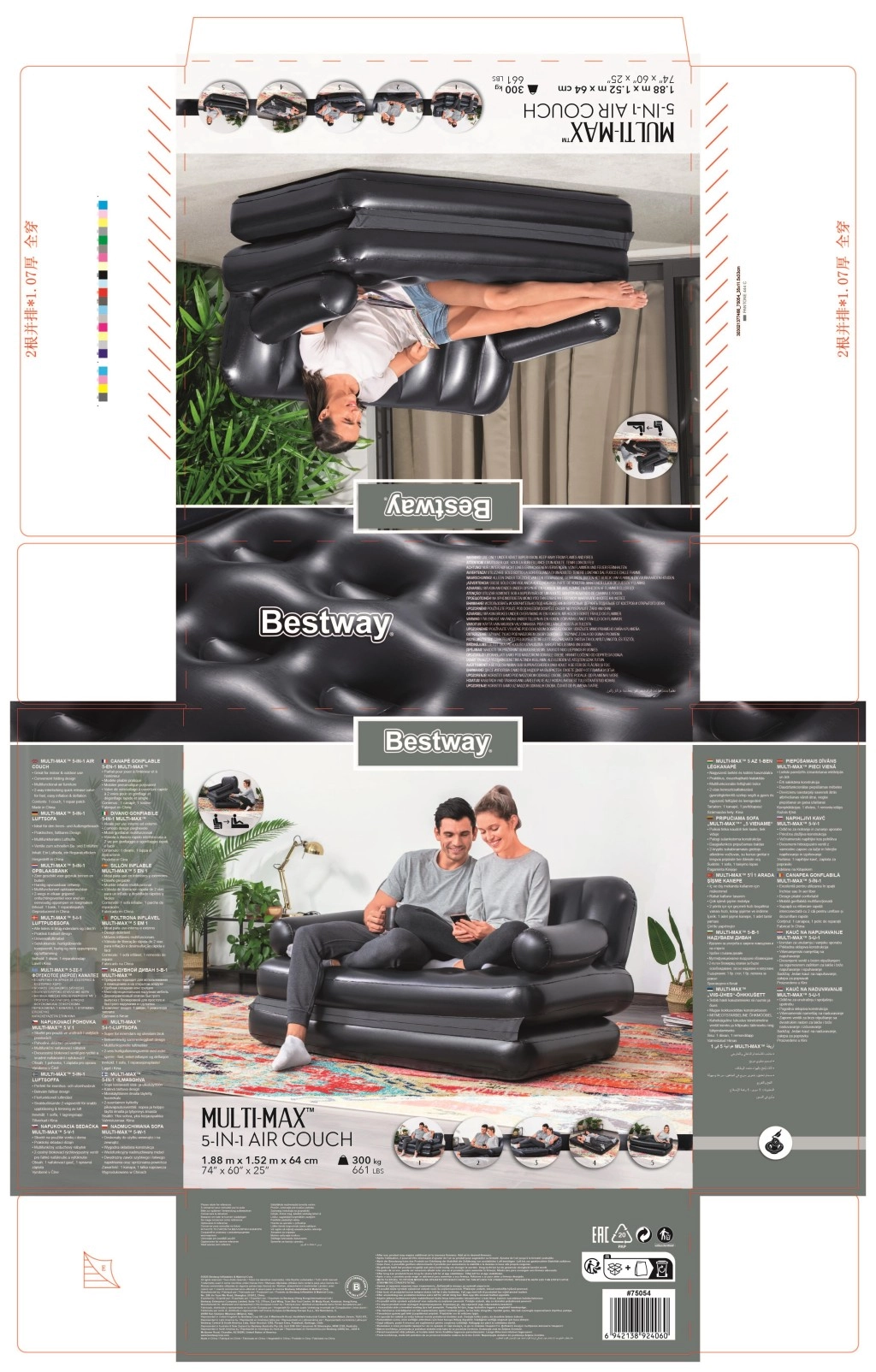 Il versatile divano gonfiabile BESTWAY 5in1 combina una seduta confortevole e un letto per due. Offre le funzioni di divano, chaise longue e letto matrimoniale a doppio strato. Il resistente PVC, la stabile struttura Coil Beam e la valvola a rilascio rapido garantiscono facilità d’uso, comfort e lunga durata per interni.