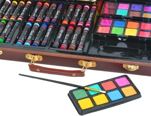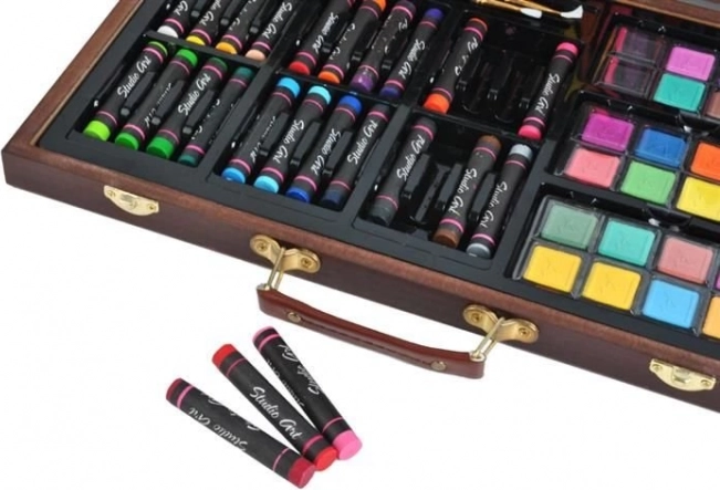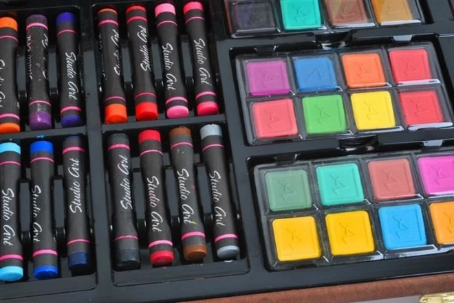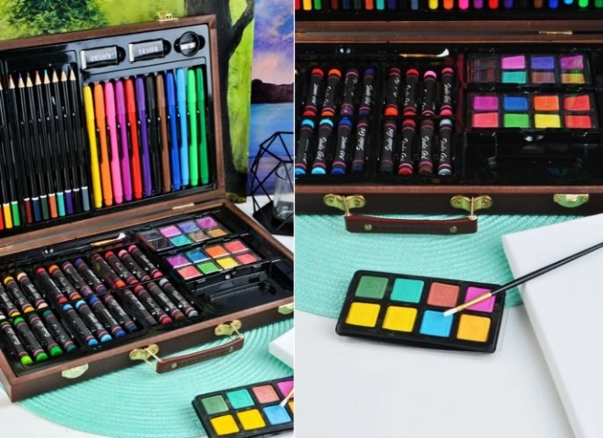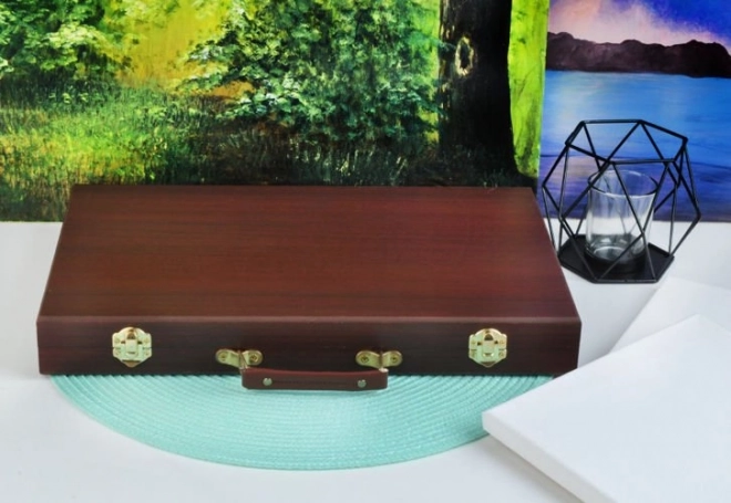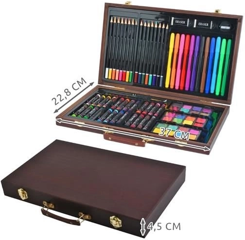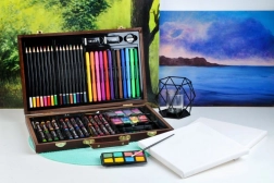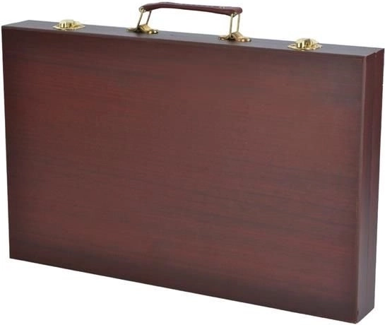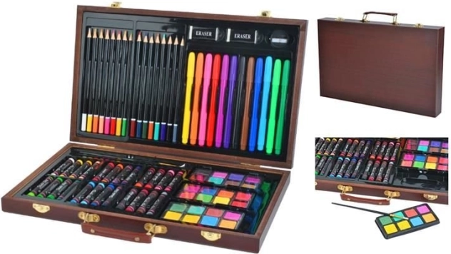 Tutti i materiali artistici sono ordinatamente sistemati in una valigetta di legno apribile con scomparti, così hai sempre un accesso rapido e semplice a tutto ciò di cui hai bisogno.