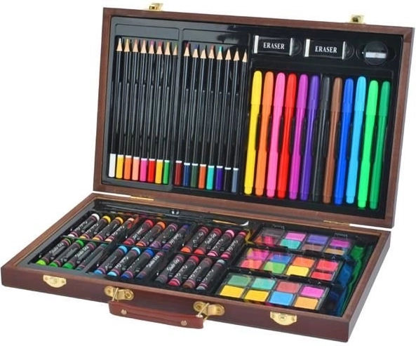 Il set comprende 24 pastelli a olio, 16 matite colorate, 24 colori ad acquerello, 12 pennarelli, 2 pennelli, un temperino, 2 gomme, blocco da disegno e libro da colorare – ottimo per bambini dai 3 anni e per adulti. Materiali di qualità e una ricca tavolozza di colori permettono di creare opere originali e fantasiose a casa, a scuola e all'aperto.