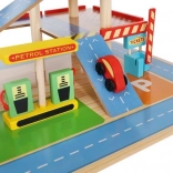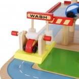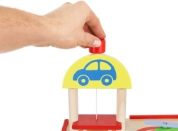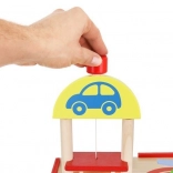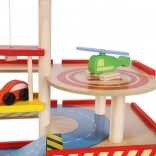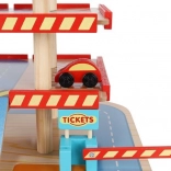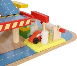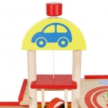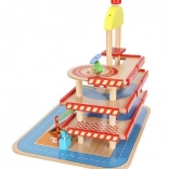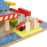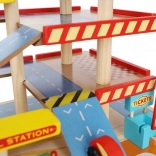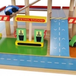 Scoprite il robusto parcheggio in legno con garage che offre tre piani di gioco collegati da rampe, un ascensore funzionante e un eliporto superiore. I bambini apprezzeranno elementi realistici come autolavaggio, stazione di servizio e vendita dei biglietti, che danno vita a scenari di traffico autentici.