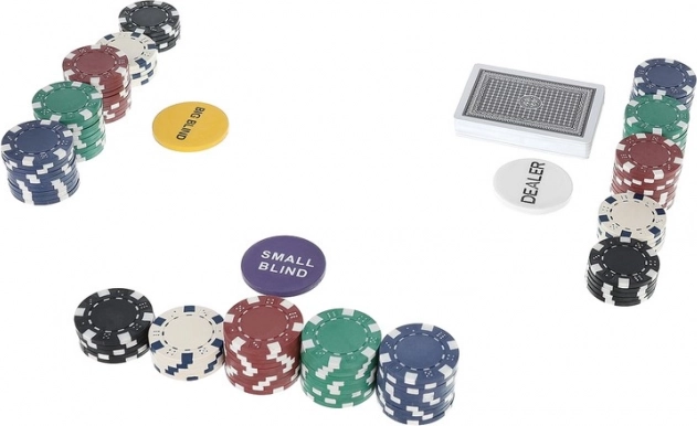 Il set include anche pratici gettoni DEALER, SMALL BLIND e BIG BLIND per un'organizzazione chiara del gioco, 2× 54 carte per una rotazione fluida dei mazzi e 5 dadi per ulteriore divertimento da tavolo. Il set è ideale per sale giochi domestiche, feste e sfide tra amici.
