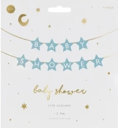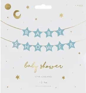 Elegante banner per baby shower con motivo di stelline e scritta “Baby Shower” in delicato colore azzurro chiaro. Ideale per decorare la festa della futura mamma, si appende facilmente e crea un’atmosfera festosa immediata. Corda di circa 3 m, dimensioni del banner 290 × 16,5 cm.