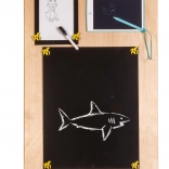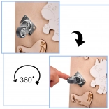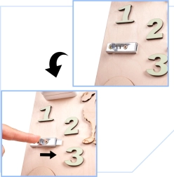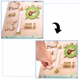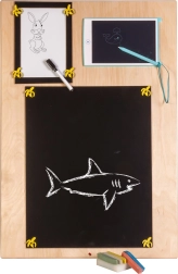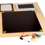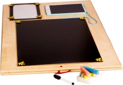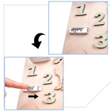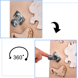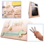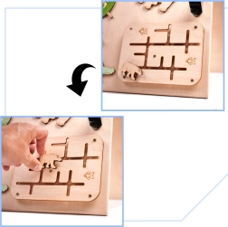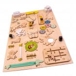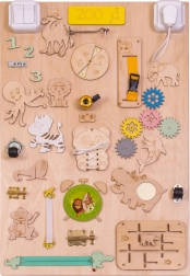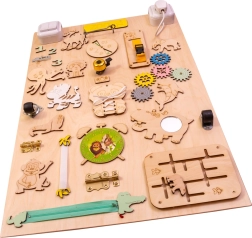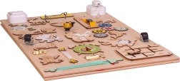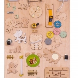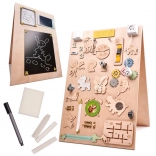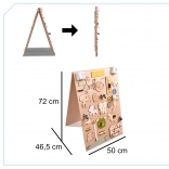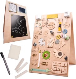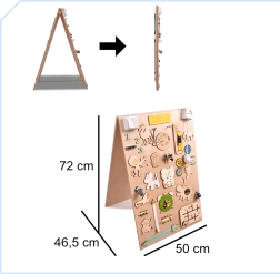 La caratteristica unica di questa tavola è la sua doppia facciata - un lato contiene molti elementi manipolativi e l'altro funge da superficie per disegnare e scrivere con gessetti, pennarelli o matite. Questo aiuta i bambini a sviluppare la creatività e la motricità fine.