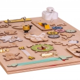 La tavola contiene ruote dentate colorate, campanelli, serrature e altri elementi interattivi che supportano lo sviluppo della motricità fine.