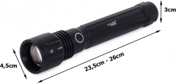 Grazie alla funzione zoom, è possibile modificare fluidamente la distanza focale della luce e una portata fino a 1000 metri. L'alimentazione è fornita da batterie al litio-ione 26650 di alta qualità che prolungano il tempo di funzionamento. La torcia offre diversi modalità di illuminazione: 100%, 75%, 50%, strobo e SOS.