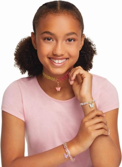 Crea la tua collezione di accessori moda con questo fantastico set di creazione di gioielli! Include tutto il necessario per realizzare *tre braccialetti* e *due collane*, incluso un trendy *choker elastico*.