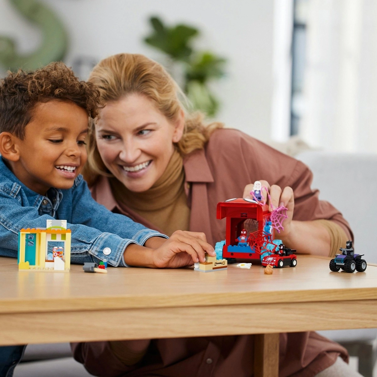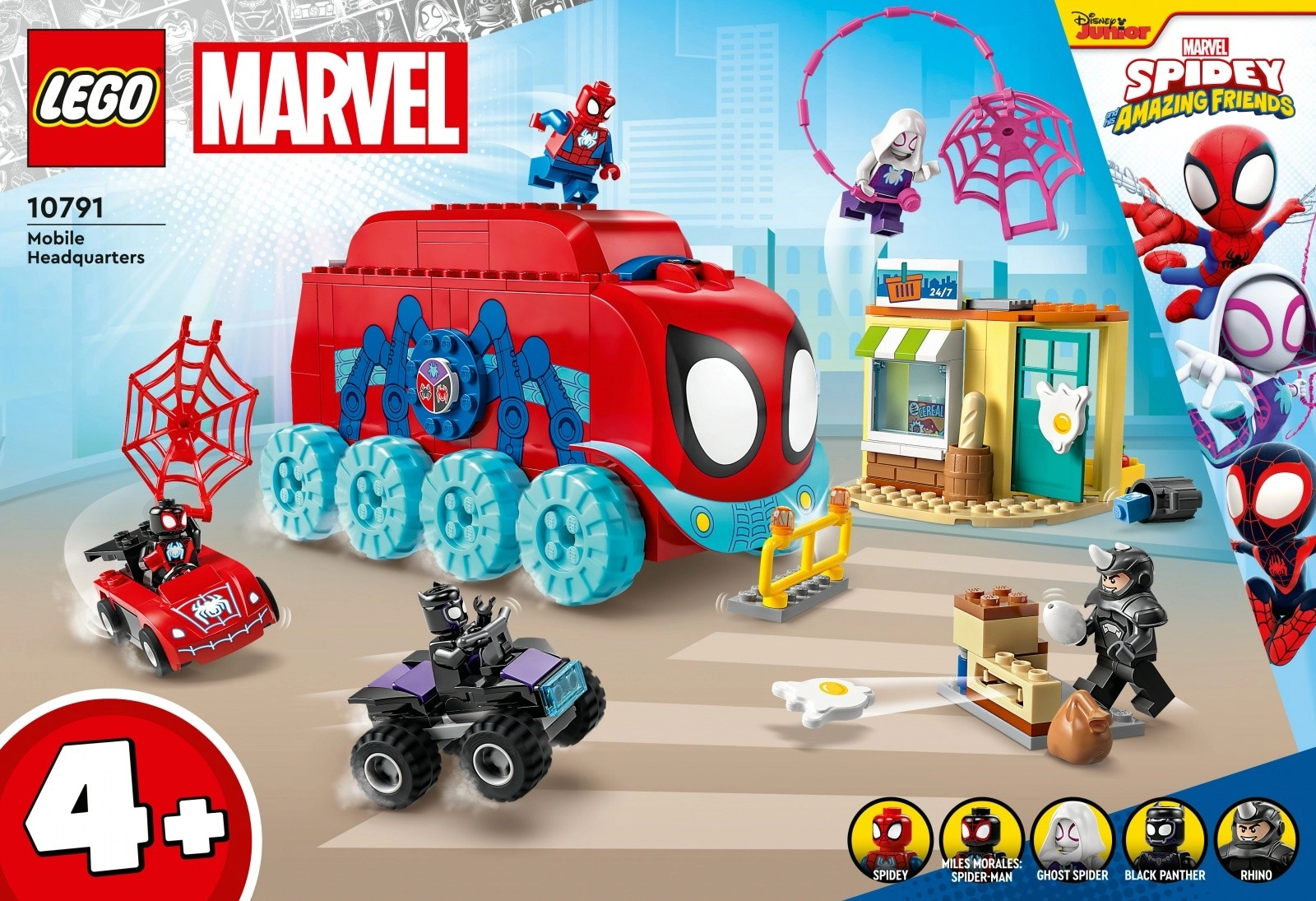 Questo colorato set per piccoli supereroi include una base mobile con cockpit apribile e rampa posteriore per caricare il roadster e i quad. Non mancano le minifigure di Spider-Man, Miles Morales, Ghost-Spider, Black Panther e Rhino con blaster di uova, un piccolo negozio e tanti accessori con ragnatele per un gioco creativo.