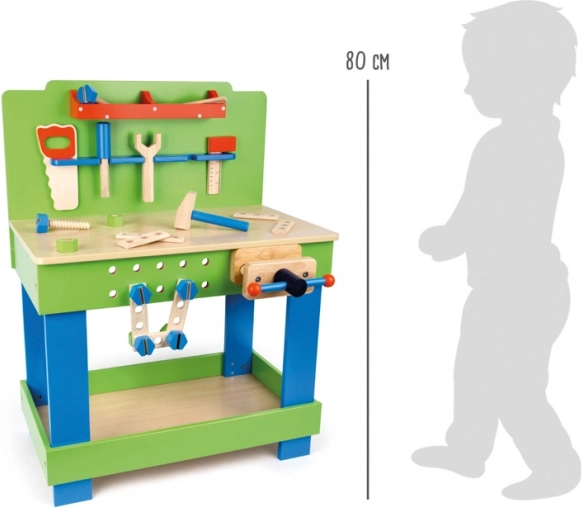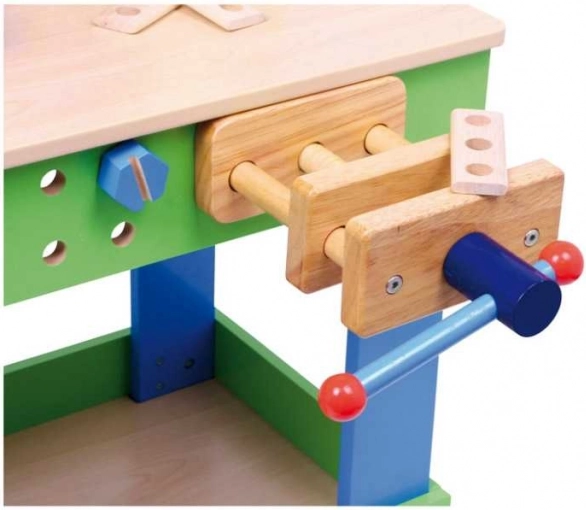 Il banco è saldamente fissato e include un morsetto per fissare i pezzi di lavoro. I bambini possono allenare abilità come martellare, avvitare, misurare e tagliare.