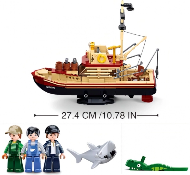 Il set di costruzioni della barca da pesca Catherine porta la gioia della modellazione ed è ideale per bambini e adulti che amano le sfide. La barca assemblata misura oltre 27 cm ed è accompagnata da un realistico squalo. Il set include tre figurine innovative con parti del corpo rotanti e snodabili, garantendo una maggiore flessibilità durante il gioco.