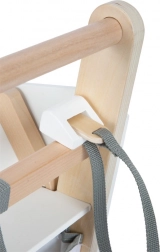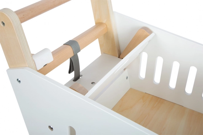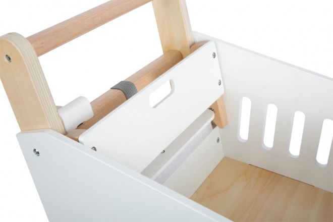 Questo carrello della spesa per bambini è realizzato in legno resistente ed è dotato di ruote gommate per un movimento silenzioso e fluido. Proprio come in un vero supermercato, c'è la possibilità di utilizzare un chip magnetico nel portacip. Il carrello offre un cestino spazioso per vari oggetti e ulteriore spazio di archiviazione nella parte inferiore.