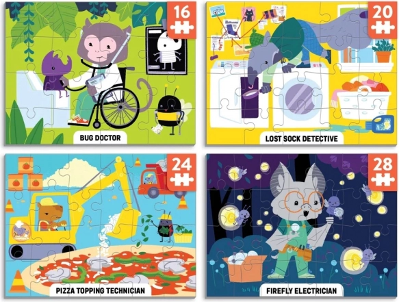 Scopri quattro divertenti puzzle in un’unica confezione! Il set Mudpuppy Level Up! propone puzzle con diversi livelli di difficoltà (16, 20, 24 e 28 pezzi), che presentano ai bambini professioni creative e spiritose – dall’elettricista delle lucciole al dottore degli insetti. I puzzle sono realizzati con materiali riciclati, hanno una finitura opaca per colori fedeli e sono confezionati in una scatola robusta, ideale per un uso ripetuto e come regalo originale.
