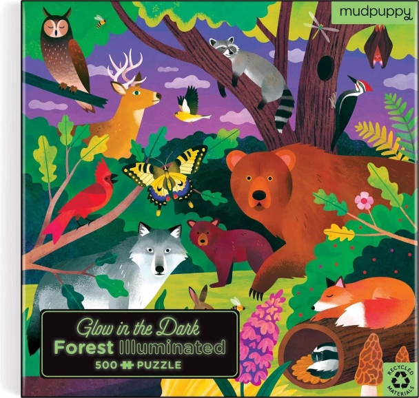 Crea una magica scena boschiva con il puzzle MUDPUPPY da 500 pezzi, che dopo aver spento le luci brilla al buio. Realizzato con carta riciclata di qualità, taglio preciso e finitura opaca per colori e dettagli fedeli. Inclusi un poster di riferimento e una scatola rigida resistente per un facile riponimento. Illustrazioni: Kaley McKean.