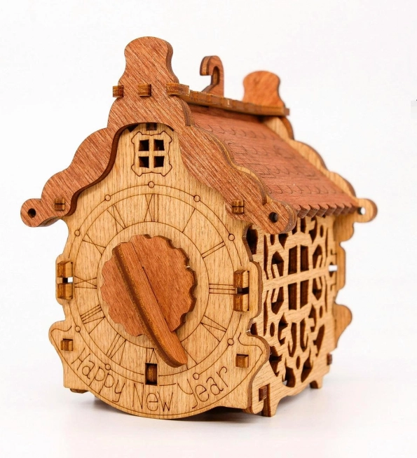 Questa scatola decorativa in legno a forma di casetta, con quadrante dell’orologio e scritta “Happy New Year”, unisce un meccanismo a rompicapo a un design elegante. All’interno c’è spazio per un piccolo dono, accessibile solo dopo aver risolto il lucchetto segreto. Grazie all’occhiello, si appende facilmente all’albero o a un ramo.