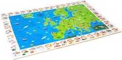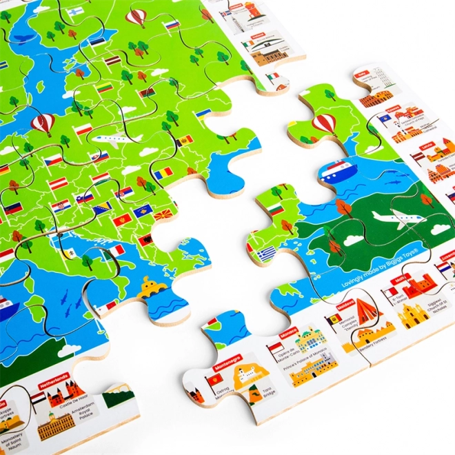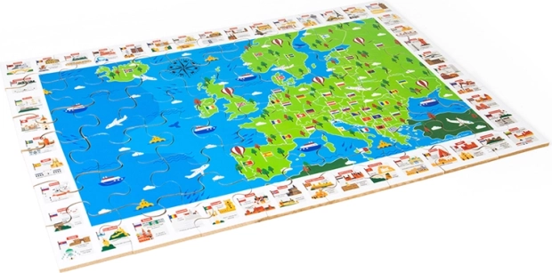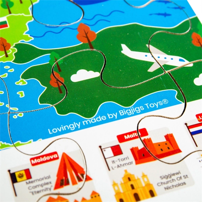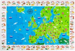 La mappa colorata dell'Europa con bandiere e monumenti iconici motiva i bambini a scoprire gli stati e la loro posizione. Comporre il puzzle sviluppa logica, orientamento e vocabolario.