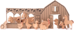 Questo set di qualità include i più amati animali da fattoria: cavallino, puledro, capra, cagnolino, maialino, vitellino, mucca, tacchino, oca, anatra, gallina, pecorella, coniglio e gatto. Grazie alla lavorazione accurata in legno di faggio, le figurine sono piacevoli al tatto, stabili e ideali per il gioco quotidiano.