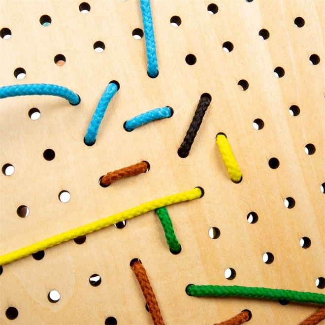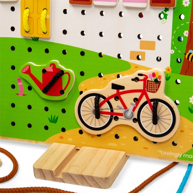 Infilare i lacci attraverso i fori e fissare i pezzi in legno allena la presa, la precisione dei movimenti e la concentrazione.