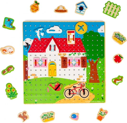 La tavoletta da infilare a forma di casetta BIGJIGS TOYS è un gioco attivo ideale per bambini dai 3 anni. Grazie alla tavola in legno perforata e ai cordini variopinti, i bambini possono creare continuamente nuove scene con i singoli pezzi: dalle finestrelle e dai fiori fino alla ruota o alle nuvole. In questo modo allenano naturalmente la motricità fine, la coordinazione occhio–mano e la concentrazione.