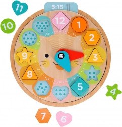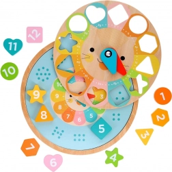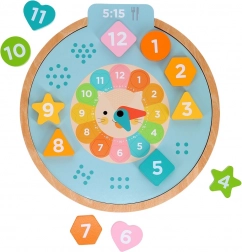 Include lancette e forme mobili che i bambini possono inserire nei punti giusti, stimolando la coordinazione e la motricità fine.