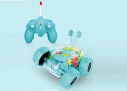 Divertente auto RC con chassis verde trasparente che mostra gli ingranaggi in movimento e offre rotazioni a 360° in verticale, acrobazie, effetti luminosi e sonori e un controllo semplice avanti/indietro e sinistra/destra. Portata del radiocomando fino a 10 m, velocità massima 5 km/h.