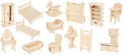 Set completo di mobili in legno per casa delle bambole con 34 pezzi e 175 elementi da assemblare come puzzle 3D. Include un armadio apribile, una cassettiera, toeletta con sedia, letti, tavolo con sedie, cucinino, lavabo e WC, culla e cavalluccio a dondolo e altro ancora. Il legno naturale è adatto alla pittura, e la rifinitura è facilitata da 3 fogli di carta vetrata. Un ottimo gioco per sviluppare creatività e abilità sociali dei bambini dai 3 anni in su.