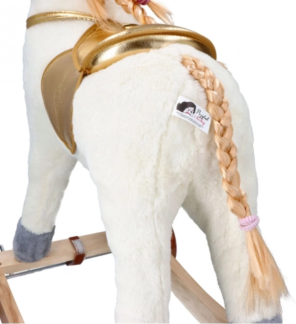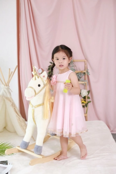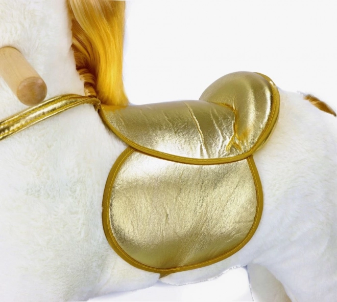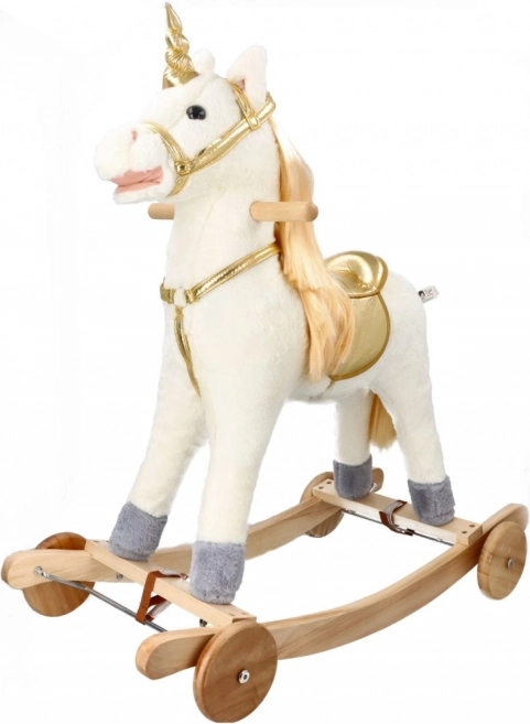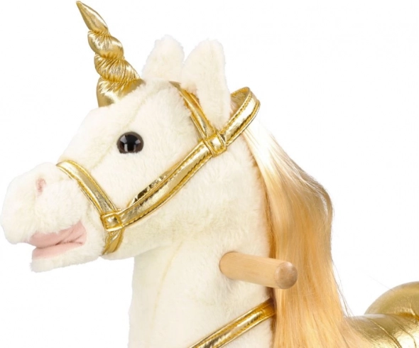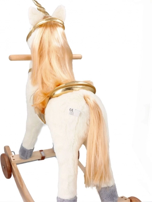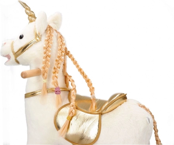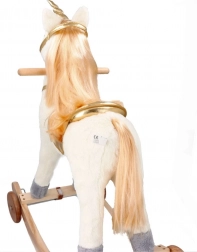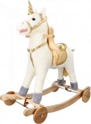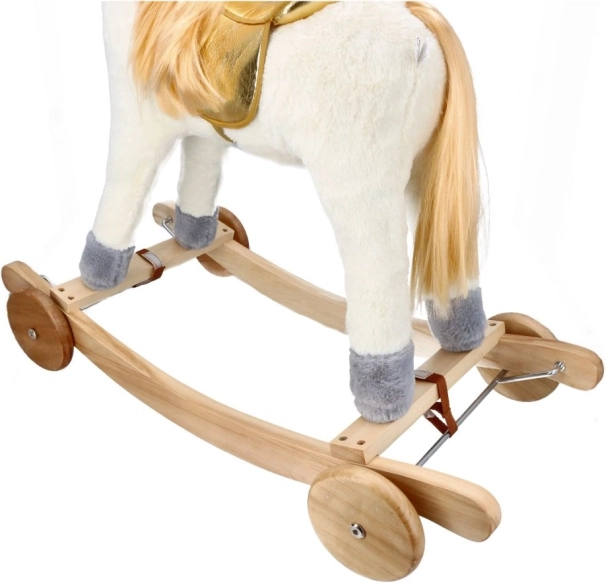 Scopri l'emozione di cavalcare su questo bellissimo unicorno dorato. Con un morbido peluche offre un'esperienza confortevole e divertente per i tuoi bambini. La costruzione in legno stabile e i dettagli dorati eleganti portano un'atmosfera magica a ogni gioco.