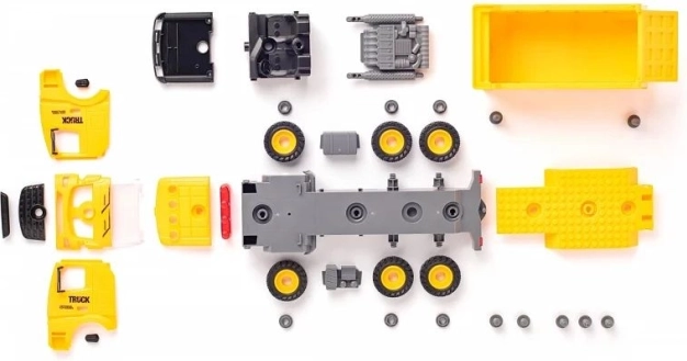 Il set include parti in plastica del veicolo e ruote per il montaggio autonomo. I bambini assemblano il mezzo e possono subito partire per il cantiere.