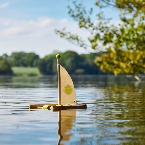 Lo scafo in legno leggero e la vela semplice stimolano il gioco immaginativo e avventure acquatiche in sicurezza.