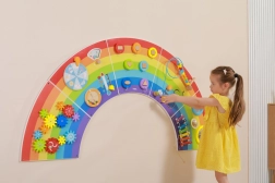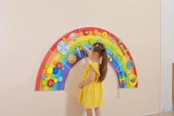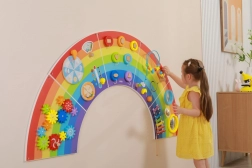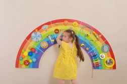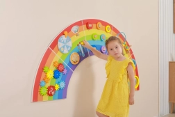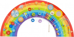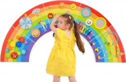 Questo grande pannello attività a forma di arcobaleno è l’elemento ideale per camerette, sale giochi e spazi educativi. I bambini possono esercitare in modo ludico la coordinazione occhio–mano, allenare la pazienza e scoprire colori, forme, suoni e condizioni meteo. La forma curva favorisce il gioco simultaneo di bambini di diverse altezze.