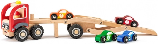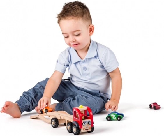 Il set include un camion con rampa e quattro macchinine colorate che si possono caricare e scaricare liberamente. Le ruote in gomma della bisarca garantiscono un movimento silenzioso e fluido sul pavimento, mentre le dimensioni compatte sono comode anche per le mani più piccole.