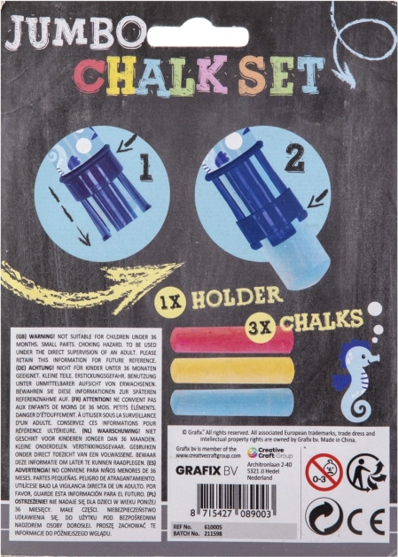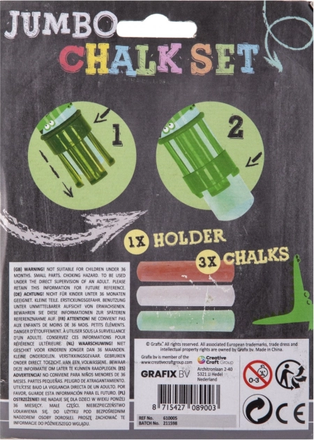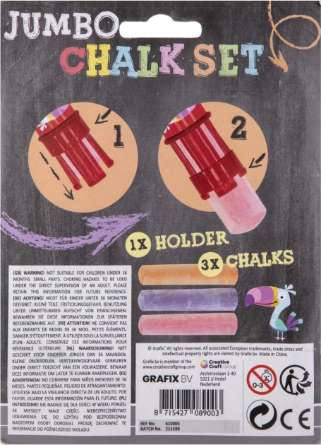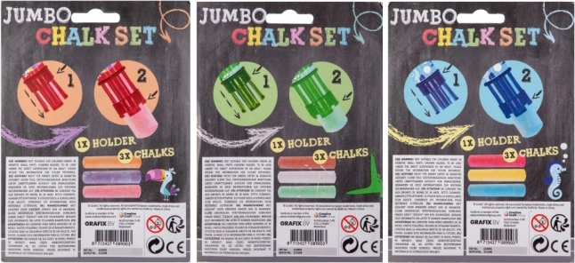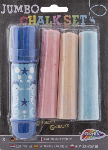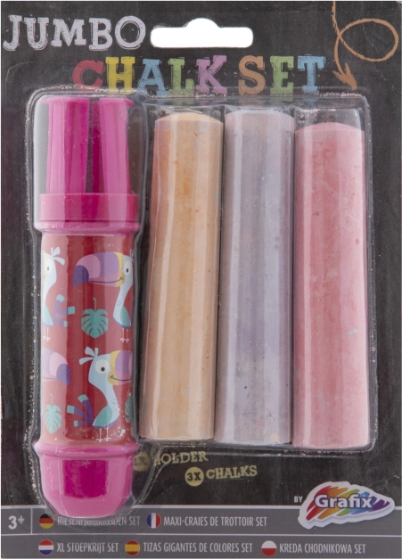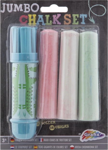 Scopri il piacere di disegnare su marciapiedi, cortili o campi scolastici. I gessetti extra spessi di tipo jumbo si impugnano facilmente e si rompono meno; il portagesso mantiene inoltre le mani pulite e facilita l’uso anche ai bambini più piccoli. La confezione contiene 3 gessetti di colori diversi, che creano tratti marcati e uniformi.