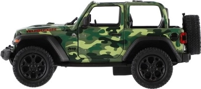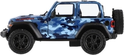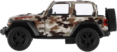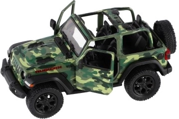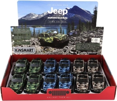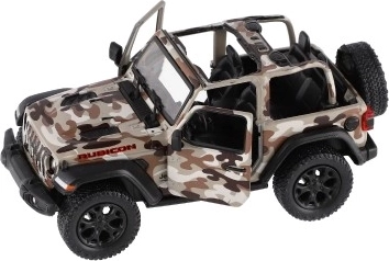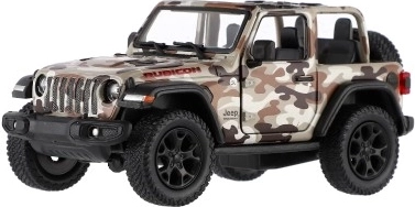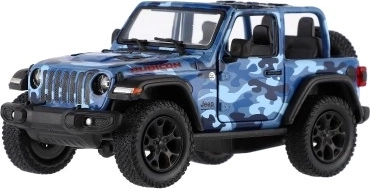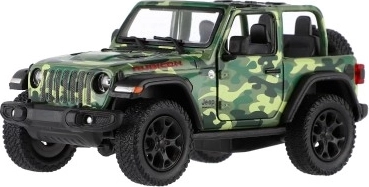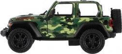 Modello in metallo Jeep Wrangler, edizione Camo con dettagli realistici, porte apribili e meccanismo a retrocarica, disponibile in tre colori. Ideale per piccoli avventurieri e collezionisti.