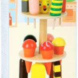 Il set offre 15 diversi “gusti” con colori e decorazioni accattivanti, che i bambini adorano combinare e “vendere”. La struttura stabile in legno assicura un’esposizione sicura di tutti i pezzi e un’organizzazione ordinata.
