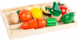 Ogni alimento è diviso in parti unite dal velcro – i bambini possono tagliare in sicurezza con il coltello di legno sul tagliere e poi riunire tutto con facilità.