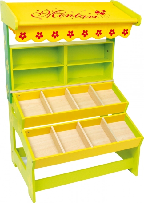 Supporta i tuoi bambini nell'apprendimento delle abitudini sociali e nello sviluppo delle abilità comunicative e matematiche con questo moderno stand di vendita. Il chiosco è dotato di una tenda in tessuto con fiori rossi. Nota: Decorazioni e accessori non inclusi.