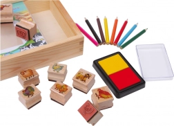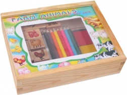 Questo set include una vasta gamma di timbri che mostrano diversi abitanti animali della fattoria. I bambini possono colorare ogni motivo usando 8 pastelli inclusi, il che permette infinite combinazioni di disegni colorati. La scatola di legno offre una soluzione di archiviazione ideale per tutto ciò che i bambini hanno bisogno per creare, rendendo questo set perfetto anche per i viaggi.