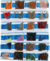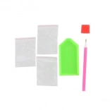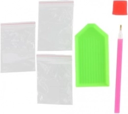 - Tela con motivo prestampato e strato adesivo, penna applicatrice, vaschetta, cera, set di diamantini colorati, legenda dei simboli