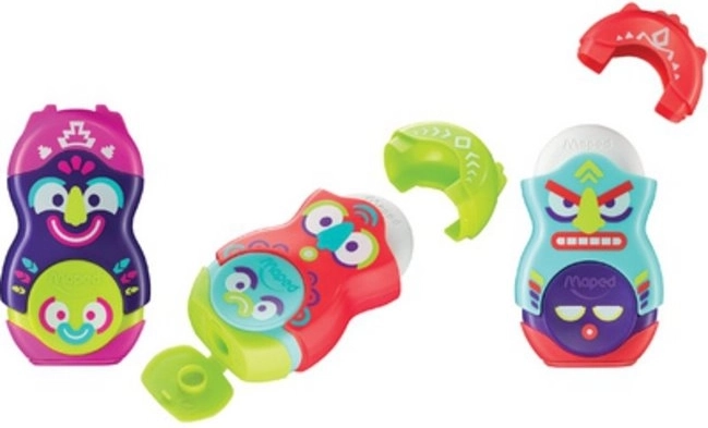 Dai nuova vita all’astuccio di bambini e adulti creativi. Il temperamatite MAPED Loopy Totem combina un affilatura precisa di matite e pastelli con una pratica gomma senza PVC. Il serbatoio per trucioli integrato mantiene in ordine banco e zaino.