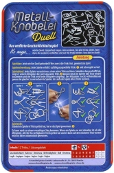 Questo set SCHMIDT Metall-Knobelei Duell offre dodici rompicapi metallici ingegnosamente progettati in una pratica scatola di latta. Ogni pezzo mette alla prova pazienza, logica e motricità fine: separa le due parti senza usare la forza e poi riportale alla forma originale. Grazie alle istruzioni illustrate incluse puoi consultare un aiuto in qualsiasi momento.