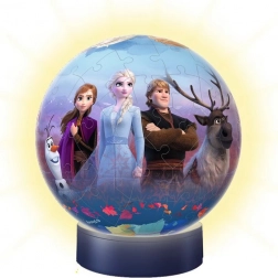 Scopri la magia con Ravensburger 3D Puzzle Ball® Frozen 2, che si accende al battito delle mani. Grazie alla perfetta precisione dei 72 pezzi in plastica creerai una sfera robusta senza bisogno di colla. I pezzi speciali curvati garantiscono che tutto si adatti perfettamente e che la sfera sia stabile una volta assemblata.